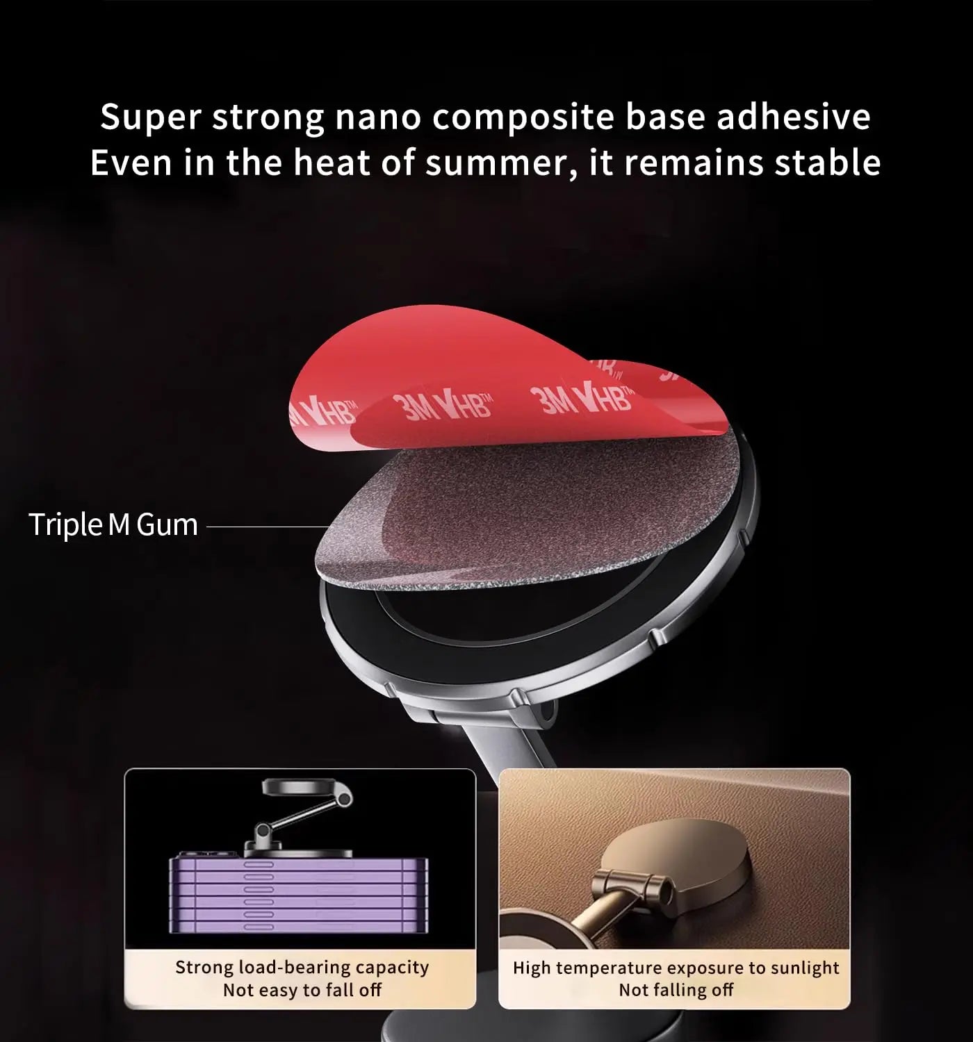 【Extra-large Adhesive Area】3M VHB sticker reaches 23cm², which is 1.8 times more than other products, making the pasting more stable. It is less likely to damage the interior compared with these traditional suction cup products. The traditional suction cups will cause irreversible deformation and damage to the user's dashboard due to vacuum suction.